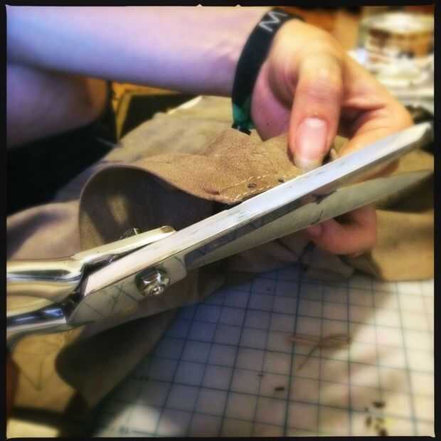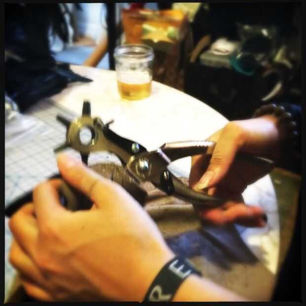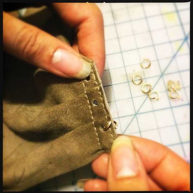 Utilizando el golpe de mano, hacer un agujero (o sin embargo muchos le gustaría) en cada chimenea y en la costura lateral. Me gusta usar un pedazo de cuero más grueso debajo para ayudar a perforar a través de todo el camino.