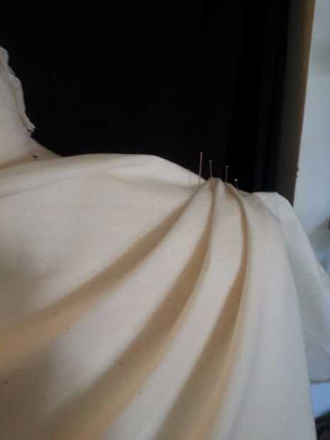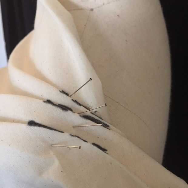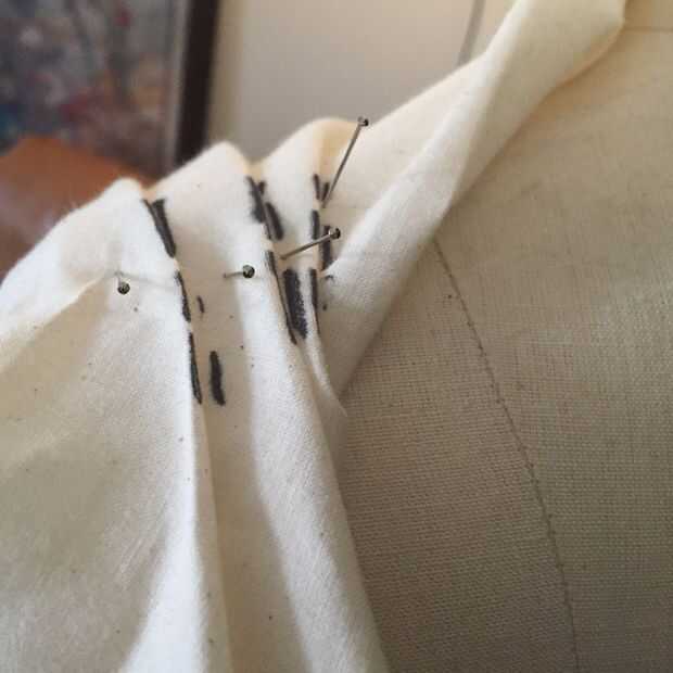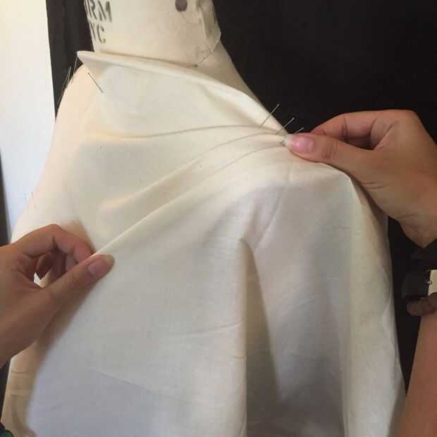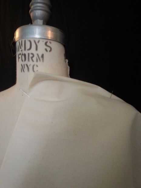 Prender la muselina en el escote, alineado con el frente de centro (FC) y en el hombro.