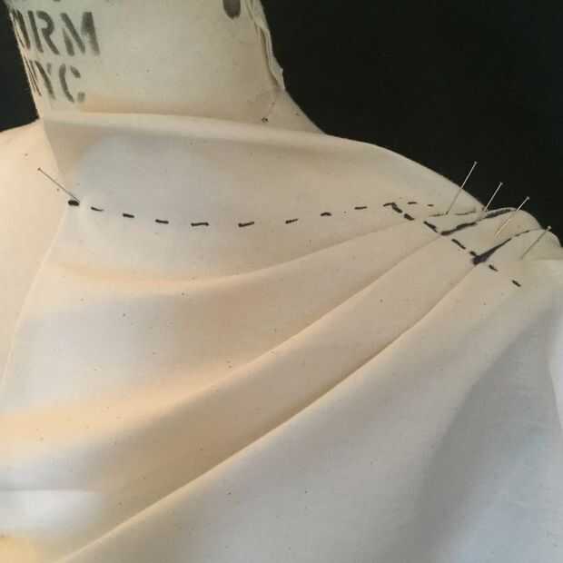 Comenzar fijando sus capuchas. Simplemente agarra a la tela y doblar para donde quiere, similar a hacer un plisado. La chimenea de la marca tanto en el lado doblado y la parte interior del doblez. Me gusta usar un rotulador para marcar con precisión ambos en un solo golpe. Ahora marcar el escote según donde cae muy bien en la parte delantera. Trazar el hombro sensación donde los bordes del hombro de la costura en la forma del vestido, lo que es lo más recto posible, como se trata de una prenda con bordes cruda.