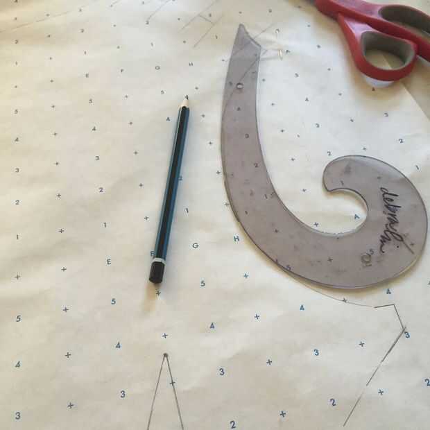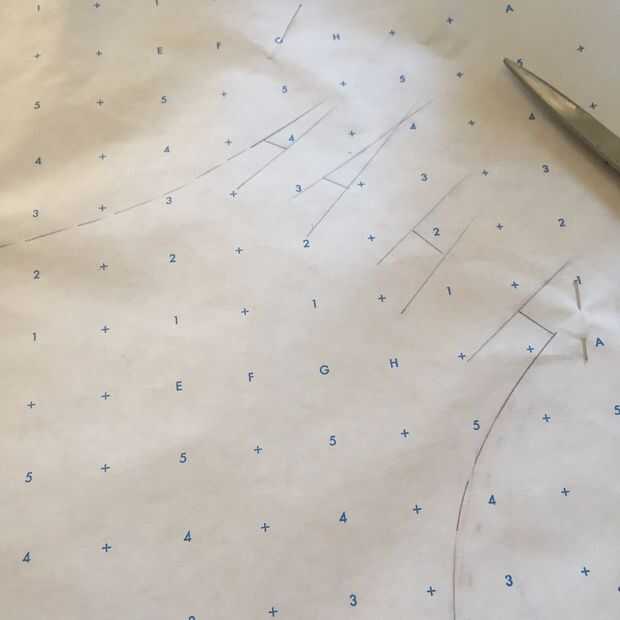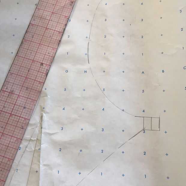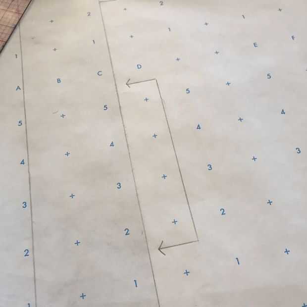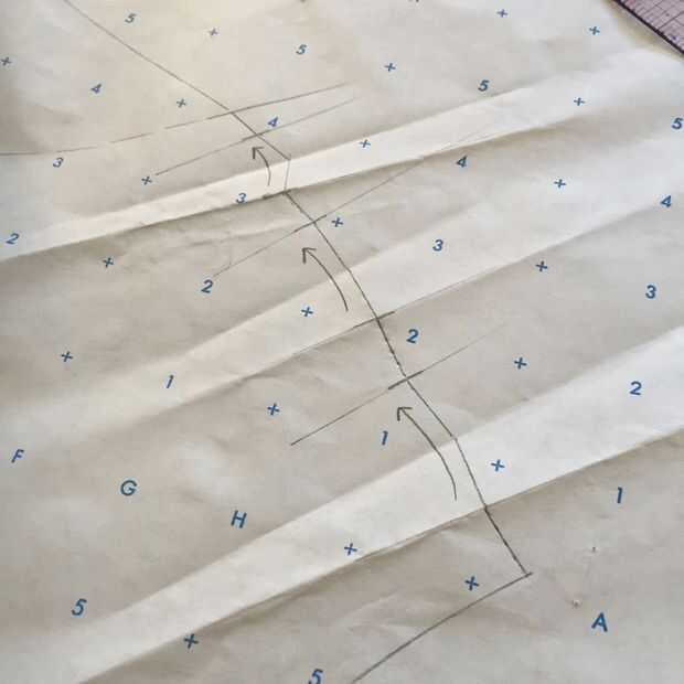 2. dibujar una línea recta vertical donde se alinearán su CF. el soporte con flechas es un marcador para "sobre el doblez," significa el patrón se refleja a través de la CF. Trace su patrón cuidadosamente, marcando los pliegues chimenea generosamente.