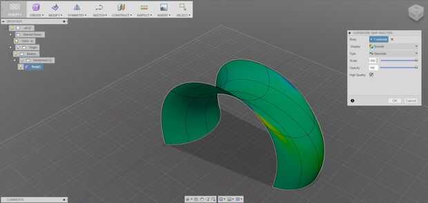 Estas fórmulas relacionan el estrés derivados de la acción de flexión con el radio de curvatura. Usted necesita asegurarse de que la tensión sigma en las áreas con la curvatura más estrechos no exceda la resistencia última del material. En mi caso usé un contrachapado de abedul de 3 mm (1/8") para poder lograr un estrecho radio de curvatura, como madera contrachapada es un material muy flexible y puede soportar grandes deformaciones antes de fallar. El modelo está claro que la zona de máxima curvatura es donde ocurre la transición entre la curvatura positiva y negativa, que corresponde a un radio de curvatura de 0.17 m. romper el cálculo: