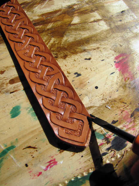 3) para hacer el cinturón de pop como el mío, usar un antiguo. Un antiguo permite las zonas empotradas ser más oscuro. Aplique antiguo en una esponja de alta densidad (importante! alta densidad hace que la esponja menos smooshy y deja la mancha en lo más recóndito. Te recomiendo que compres uno de cuero de Tandy. Se aplica en un movimiento de remolino. Algunas veces se debe aplicar dos veces. Después de aplica una cantidad suficiente, use la parte posterior de la esponja y frotar (no aplique mucha presión) cualquier exceso en una parte posteriora y adelante movimiento. Para realmente hacer pop, me rocíe un poco de agua en la esponja y luego frotar. Esto crea mayor contraste. La mancha debe permanecer en los huecos. Si no lo hace, se aplica demasiada presión o la esponja no es lo suficientemente densa. Puede arreglar añadiendo un poco más antiguo. Tratar de que la mancha incluso en todo el proyecto.