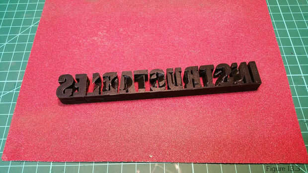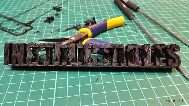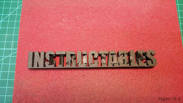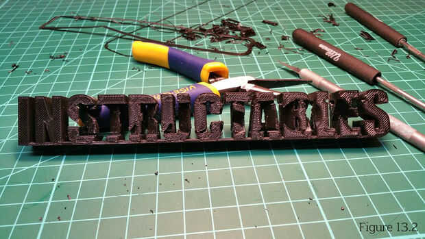 5. Hacer su toque final ups. Me gustaría eliminar la última parte del labio del ala de 5mm con una herramienta de desbarbado. Decidí lijar las marcas de impresión de la cara superior de la impresión. Me áspera lijar con grano 80 y acabado con grano 200 como se muestra en la figura 13.3. TIP: Se me olvidaba que utilizaba PLA al lijar. Por lo tanto no podía usar acetona para derretir la espalda superficie mate a brillante. Te sugiero que no la arena si utilizando PLA, como lijar el corte hacia fuera las superficies de texto destaca por el color diferente. Puede ver esto comparando la figura 13.2 y 13.4 de la figura.