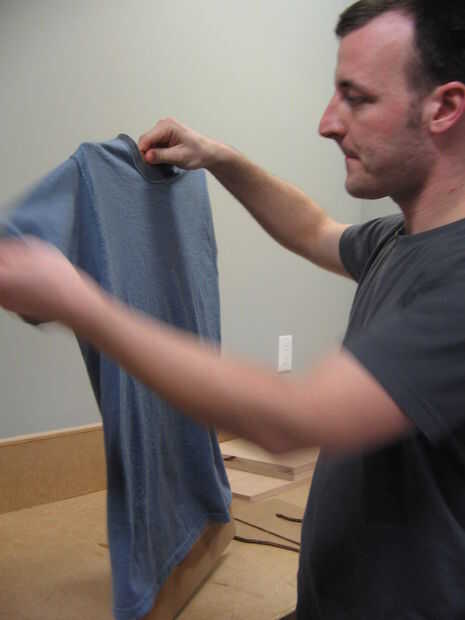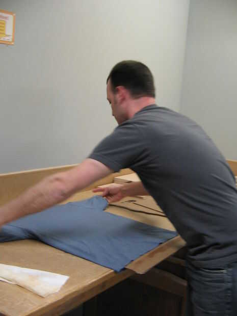 Coloque una hoja de cartón dentro de la camisa para detener el blanqueo de estarcir la imagen en el otro lado.