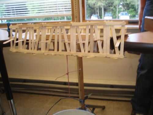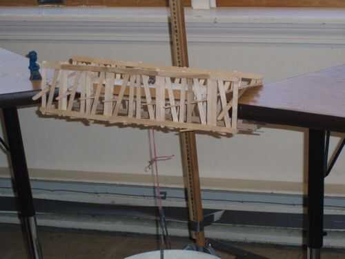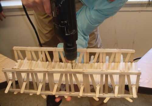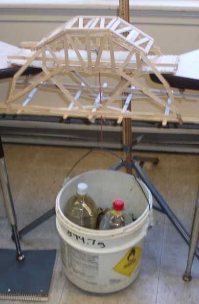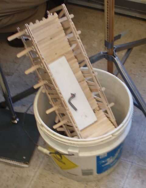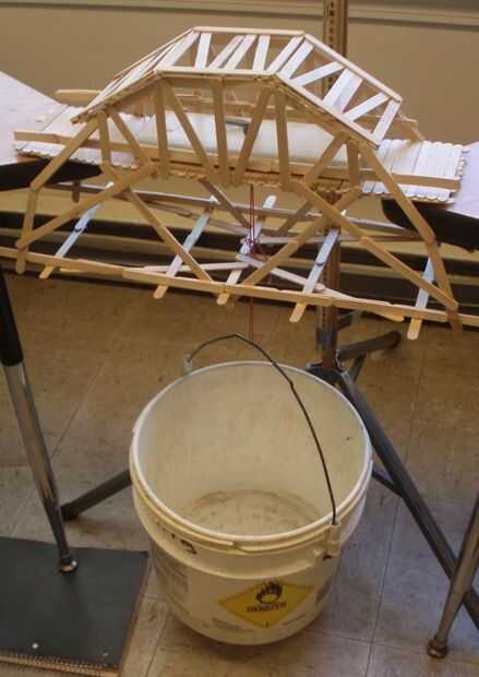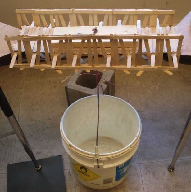 -Conecte el cable al cubo y tire a través de la cuerda del agujero que hiciste, que tire de la cuerda a través de un bloque de madera, por lo que el peso es igual distribuido sobre el puente.