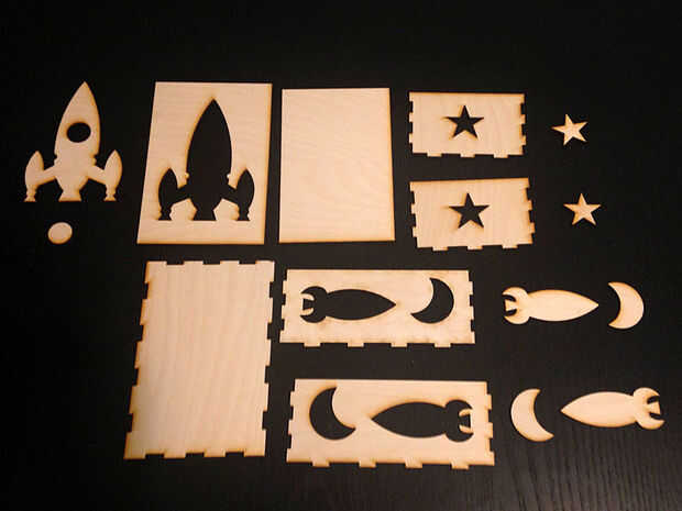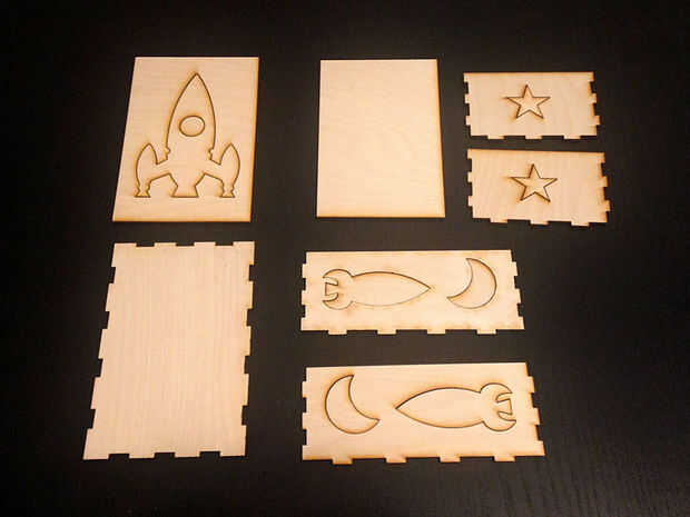 Nota rápida, el pdf que he incluido en este Instructable puede utilizarse para cortar las piezas de la caja y la incrustación de estrella. No incluyo los diseños del cohete. Usted tendrá que hacer su propio diseño de embutido.
