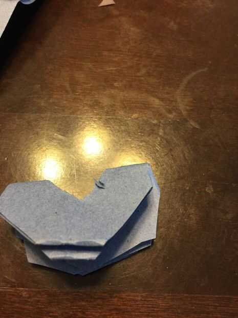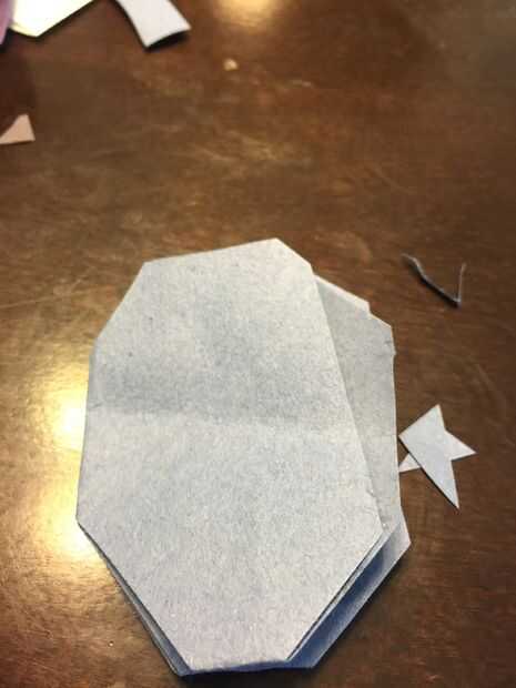 Dóblalo 2 veces y en la esquina cortar triángulos y doblar otra vez en el medio como pic 3 y cortar un semicírculo en el centro
