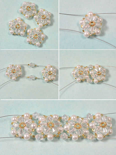 2 º, deslice una tira de Clarín, una gota transparente y una corneta del grano a cada cable y añadir otro patrón de la flor de la misma manera;