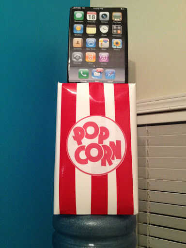 Luego con la cinta del gorila rojo, realizar rayas como se muestra en la imagen, al igual que un motivo de caja/cubo de palomitas de maíz.