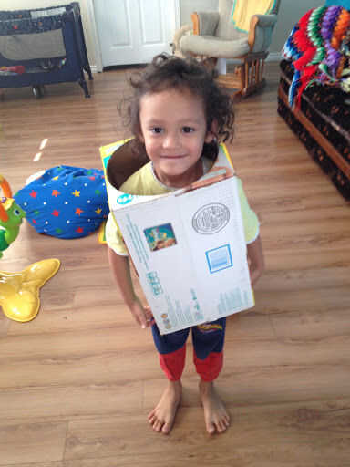 Como se trata de un chico mucho más joven, dirigiéndolos a veces ir de agujero inferior sería un dolor. No podría entender y le ser pánico/miedo, así que corte el lado entero (de la parte posterior) de un cartón donde podemos poner el traje de chaqueta.