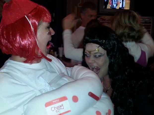 Para entrar en el traje, tienes que conseguir ayuda poner la copa sobre su cabeza. Entonces te aferras a la Copa mientras un participante dispuesto pernos eso anillo del anillo interior con los tirantes. Entonces tienen para cada uno de los dos tubos de glaseado blanco sobre su cabeza y descansan en la parte superior los aros de hula.