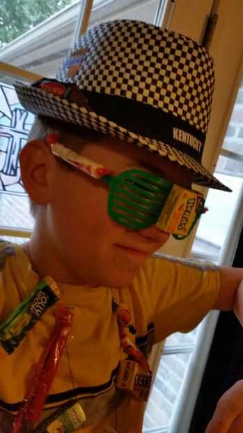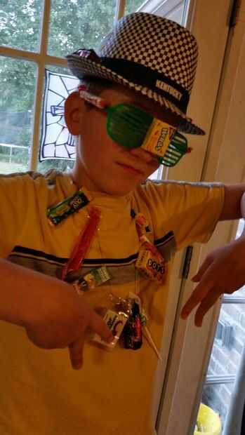Se trata de disfraces de Halloween de "Residuos tóxicos" de mi hijo Nick.  Tenemos la idea de una lata de "Residuos tóxicos" caramelo, descrito como "hazardously sour".  Básicamente, el traje es de fieltro amarillo que cubre