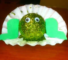 Una vez que su esfero se viste de gala fuera de brillo verde, pegamento en unos ojos de mirada para darle una sensación de froggy. A continuación, cortar las patas de rana de papel de construcción verde y doblar una parte de las patas por lo que es capaces de pegar a los lados de su esfero.