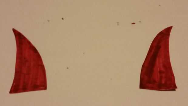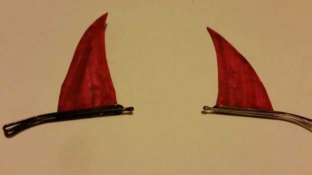 Dibujar con el color de marcador rojo 2 cuernos ambos lados rojo. Corte de ellos hacia fuera y los clips de cabello con cinta adhesiva.