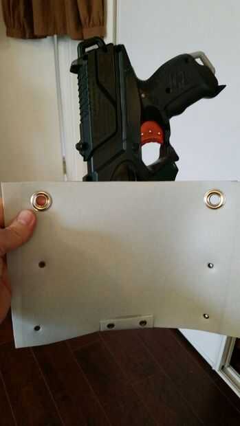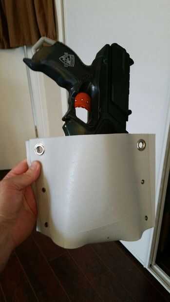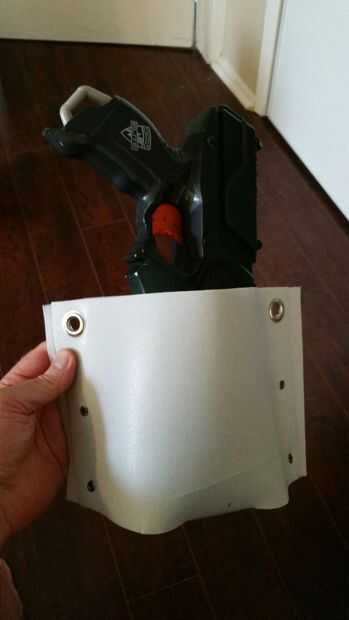 4 - pase doble echó a un lado del velcro (gancho y lazo) a través de los agujeros de fijación de la correa superior simplemente perforado y lazo a través de su cinturón a la longitud del tamaño y caída de su pistolera en el muslo y cortado a la medida. Luego, el mismo material a través de la pierna correa esperanzas y envuélvalo alrededor de su pierna y corte a la longitud de la alimentación.