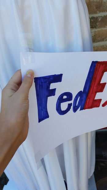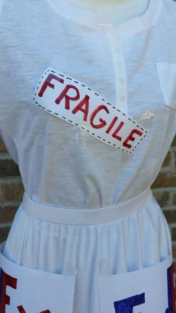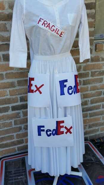 Tus signos de FedEx y la cinta del gancho agarrador. Ahora ponga cinta sobre los signos y con cinta adhesiva al vestido 3 en la parte delantera 2 en parte posterior. con las muestras frágiles 2 tape 1 al frente y atrás.