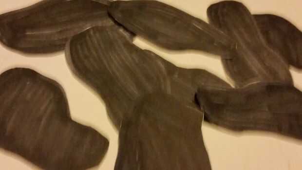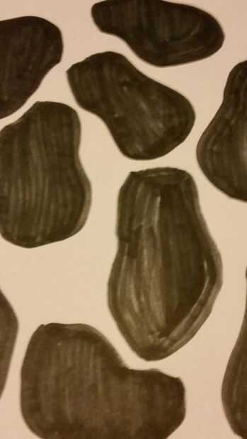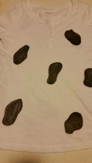 Dibujar y recortar 11 manchas de vaca poner doble cinta en la parte posterior de cada punto del palillo y cinta 6 en la parte delantera y 5 en la parte posterior de la camisa blanca