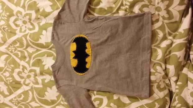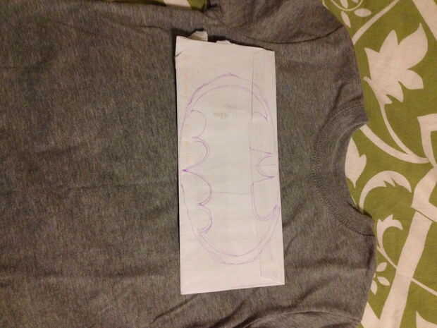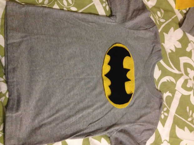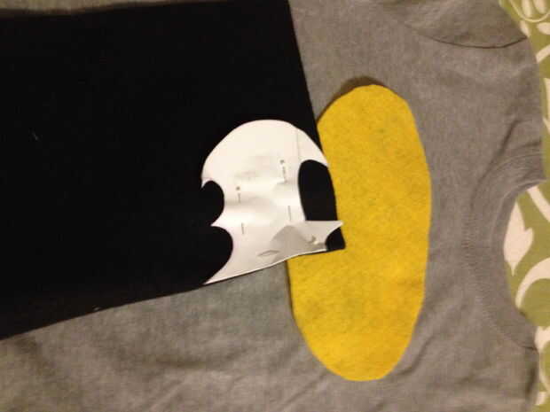 La única alteración necesaria para la parte superior fue la marca símbolo de Batman. Empezamos utilizando un trozo de papel y dibujo gratis el logo. Una vez mirado derecha, cubrió el papel para el fieltro y cortamos el diseño a través del papel y fieltro. El óvalo se corta para caber el bate.
