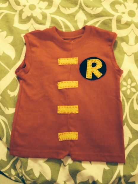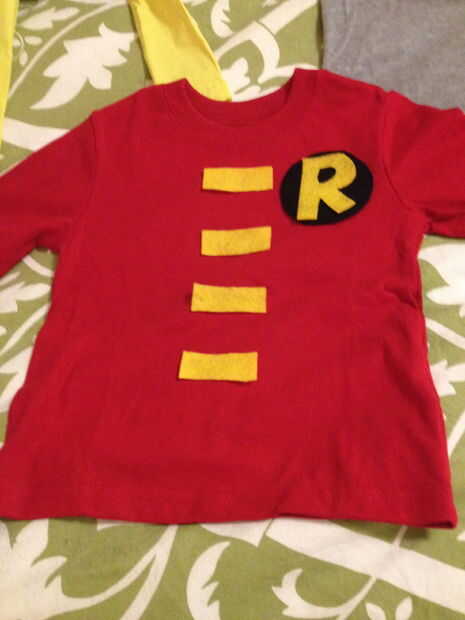 Ver arriba para obtener instrucciones sobre cómo hizo "R" de Robin símbolo. Los "sujetadores" amarillo en la camisa de Robin simplemente hicieron rectángulos corte de fieltro y costura de hilo de bordar rojo alrededor de los bordes y entonces mano-que cose con acolchar hilo en la camisa.