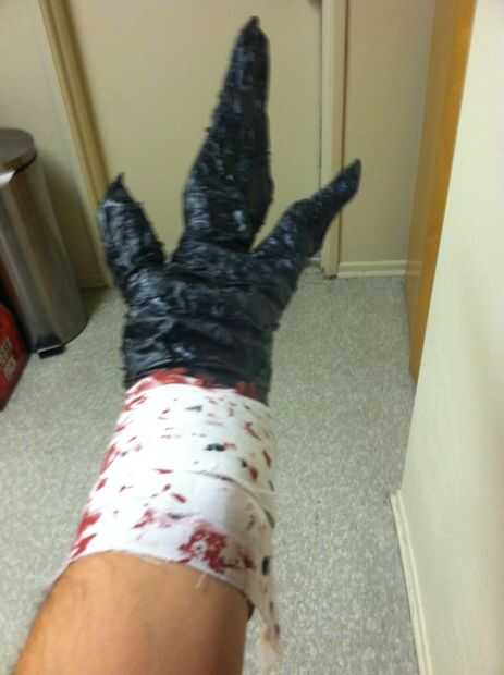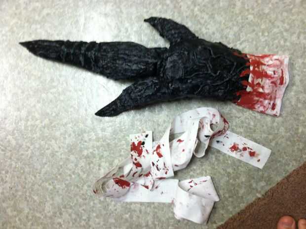 Uso de algunos de esa tela blanca y pintura roja para hacer un vendaje sangriento