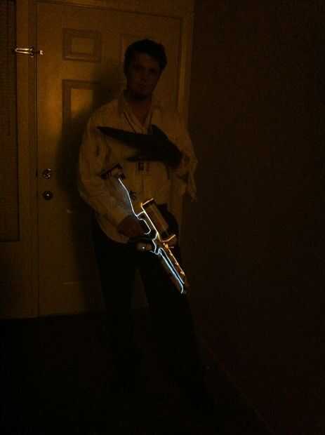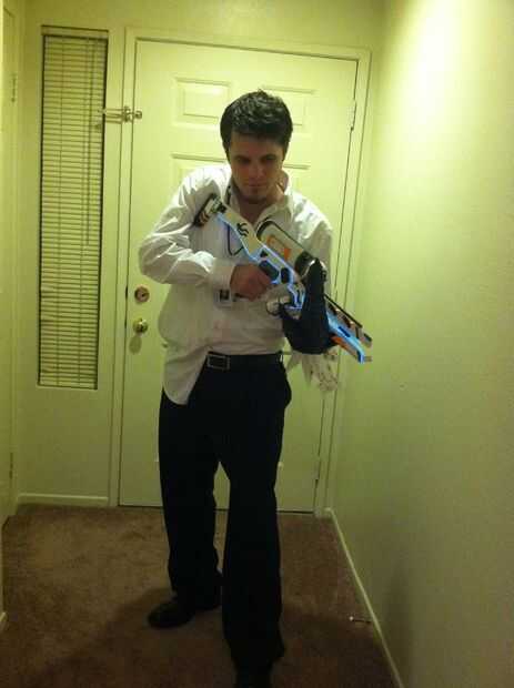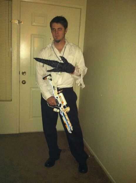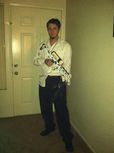 Completa el traje con un botón de sucio y rasgado para arriba de la camisa, pantalones negros, zapatos de vestido, cabello desordenado, sombra de 5:00 y sangre azul (que no he podido encontrar en el tiempo)