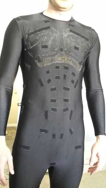 Este fue el mayor reto del proyecto. Tengo en muchos sitios web diferentes de vestirse para ver lo que otros habían hecho para fijar la espuma al tejido. Muchas personas decían pegar directamente a la demanda, aunque no hubo mucho acuerdo sobre que tipo de pegamento era lo mejor. Como Halloween se acercó me dio más preocupada que yo no iba a poder trabajar este proyecto. Probé el método de pegamento. Como puede verse en la foto, realmente no funcionan. El tiempo de colas de tela la mayoría es por lo menos una hora, generalmente más a 4. Para realmente tener las piezas pegadas en el lugar correcto, necesito usarla y esperar. Lo probé con mi pechera. Flejada en con las correas para mantener apretado. Vi una película... y pegado... a mí. Incluso tenía dos capas de camisetas debajo de él y fue a través de todo. Entonces, cuando fui a sacar el traje, la espuma comenzó a pelar.