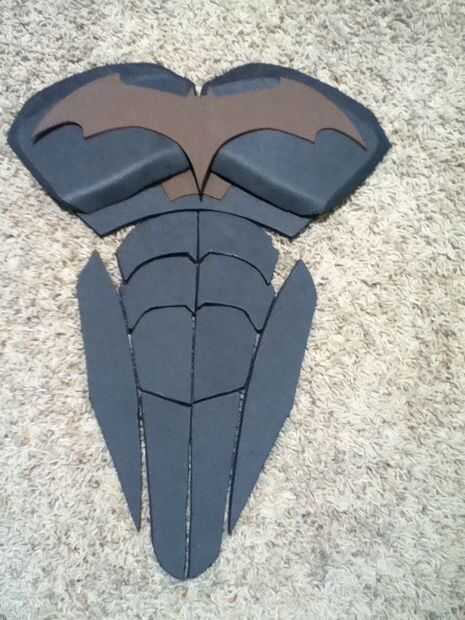 Las piezas que se muestra en la imagen muestran un par de las cosas que necesitaba hacer. La espuma marrón es espuma de arte y trabajó bien el símbolo de batman. También se puede ver que tenía que hacer algunas cosas extra para hacer la pechera me dan cierta energía extra pectoral. Tuve que doblar y formar la forma para caber en mi pecho y agregar volumen extra. Usé lo que aprendí en este instructable para hacerlo.