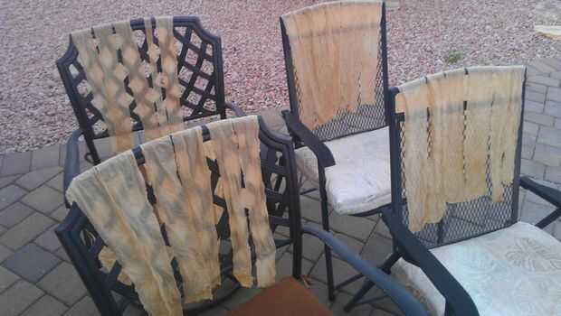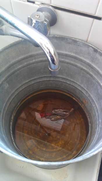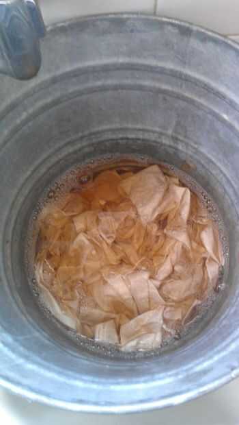 El siguiente es el proceso de muerte. Usé aproximadamente 4 bolsas de té negro y llena el cubo con agua. Añadido las vendas asegurándose de que se sumergieron completamente. Les dejo sentarse, revolviendo ocasionalmente, durante unas 3 horas.