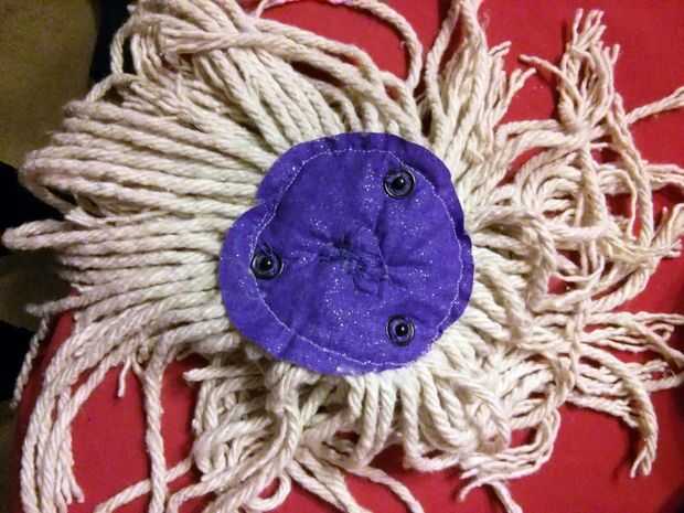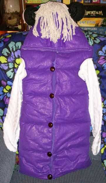 La tela minky fue mano cosida a los agujeros del brazo. Usé Velcro para fijar la campana para el traje, además de lazos botones y elástico para cerrar el traje por la espalda.