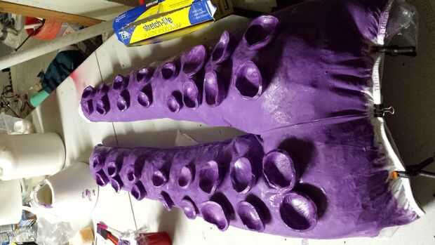 Pies se fabrican de la misma goma espuma cuando se calienta con una pistola de calor. Entonces primer Rosco Flexcoat y pintura con la mezcla de látex acrílico/líquido. Otra vez, no se debe confundir esto con "pintura" de la tienda de hardware que no flex, se agrieta y te dará resultados mucho peores. Luego se pegan las conchas acabadas para chatarra zapatos utilizando cemento de contacto. Esto se debe hacer o que cambiar todo y ser muy incómodo.
