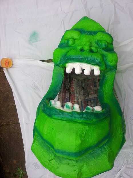 Slimer para mirar un poco más espeluznante que decidí darle sus ojos pupilas naranja con llantas negras con color espuma hojas cortadas que entonces estaban calientes pegados directamente sobre los globos oculares amarillos.