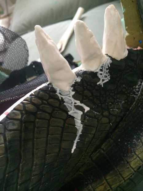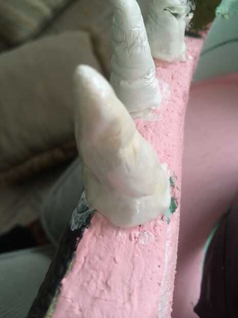 Pellizque y play-doh (blanco) la forma en los dientes de tamaños adecuado. Entonces les había pintado con caucho líquido Plasti cote. Esto les da un bonito color toothy manteniendo eficazmente plastilina suave como en el frasco. Proporciona cierta resistencia al contacto accidental.