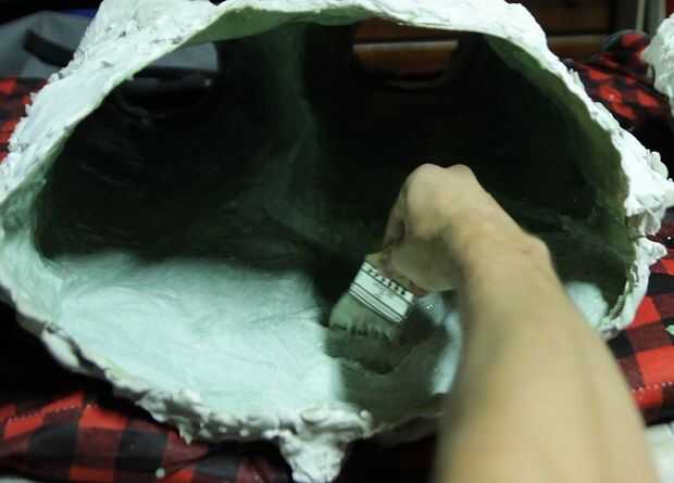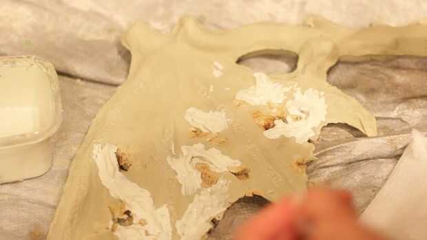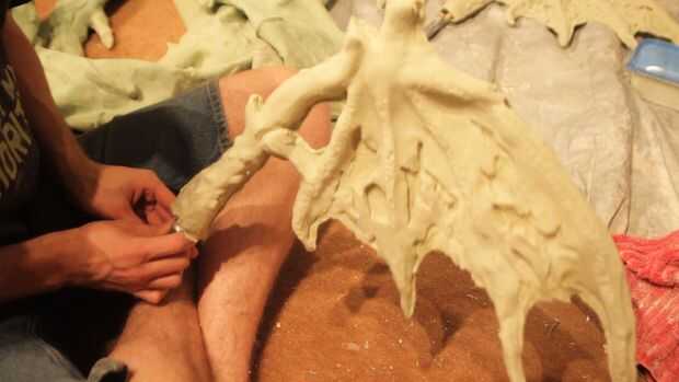Las alas fueron un desafío único. Desde que tuve un molde, con dos mitades no simétricas y sólo un pequeño orificio abierto, realmente no podía hacer casting del aguanieve. Probé por si acaso, pero absolutamente no funciona. Entonces pensé que sólo haría mitades, no un ala completado, solo mostrando la cara buena hacia adelante. Construí unos 6 o 7 capas a cada lado. Pero como tuve látex acumulado en cada semestre, decidí unirlos juntos, y después de muchas correcciones y reparaciones, pude hacer todo alas de dos mitades.