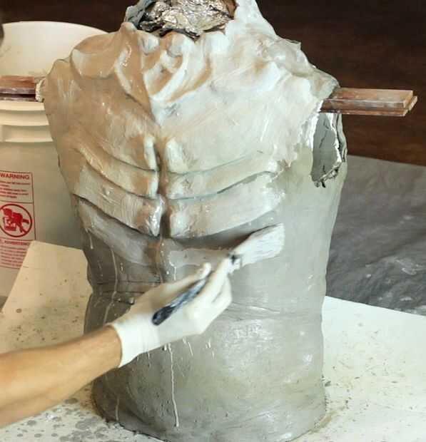 Otra vez, puesto que la forma del cuerpo torso tenía era hueco, todo tendría que hacer es la arcilla con yeso y luego vaciar el interior. La parte de yeso fue suficiente, fácil cepillado sólo en la capa de belleza inicial, luego agregar más acumulación y también remojar el yeso en un paño de corte-para arriba de la lona para darle más fuerza. Esta fue mi primera vez utilizando Ultracal para el moldeado, en comparación con yeso de París. Ultracal es mucho más fuerte, agradable para trabajar con.