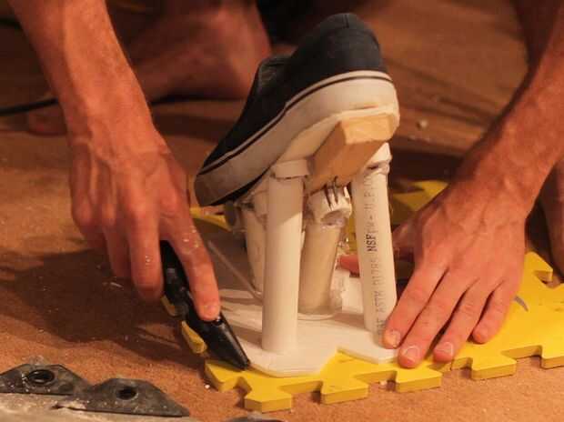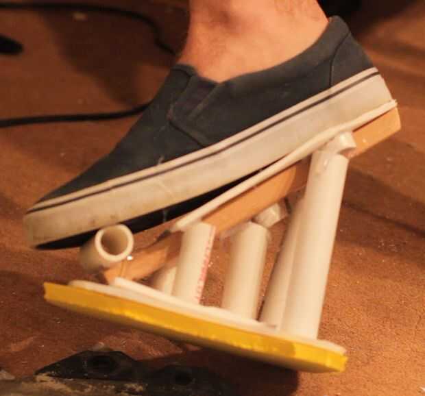 Pilotes están hechos casi siempre de fuertes trozos de madera o metal. En un presupuesto y calendario, surgió una alternativa más rápida y más barata. Utilizo un trozo de madera de la pieza principal de pie, pero el resto fue construido con tubo de PVC y espuma. Zancos muy baratos. Clavó unos zapatos viejos en la madera y un montón de pegamento caliente para refuerzo. También he añadido algunas almohadillas de espuma en la parte inferior. Soportar mi peso, aunque como cualquier zancos digitigrade, son un poco incómodos en los dedos del pie.