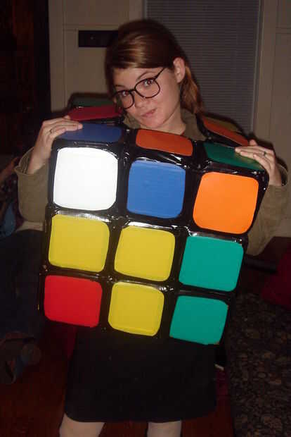 disfraz de cubo de Rubik necesita:caja cuadrada de 1 (más difícil de encontrar de lo que suena)fieltro de color 54 plazas (2 más grande donde salen los brazos)1 puede rociar pegamento2 rollos de cinta aislante negraEn primer lugar, cortar un área fue