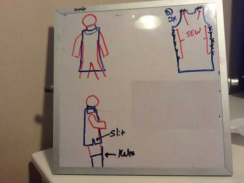Cortar la tela azul en un largo "forma de camisón / tank top" (foto B)... necesita dos piezas para el frente y la espalda. Cosí los costados y los hombros juntos... Si se siente lo suficientemente segura, la duración debería extenderse a medio muslo del individuo. luego tomó una tira y envuelto alrededor del cuello.