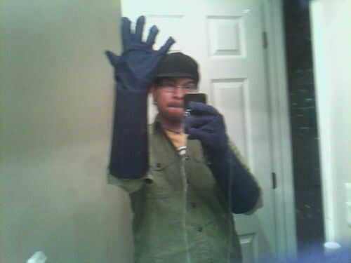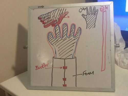 Es más fácil trabajar con el guante en su mano. corte dos formas de C (uno para la parte superior de la mano, uno de la palma). Pegamento caliente en el guante. toma una larga tira de tela (Foto D) y cubre el borde de tu mano. (diagrama)