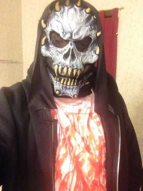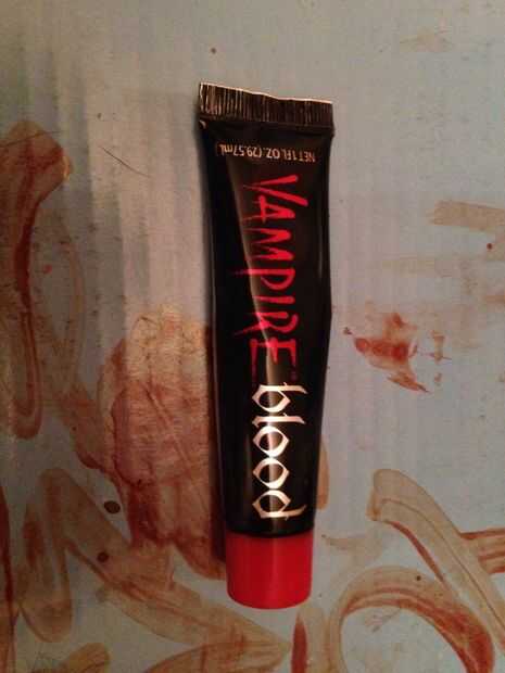 Después de elegir mi personaje la búsqueda era en mi máscara. Elegí una máscara azul con cuernos, que parecía espeluznante pero que pensé que podría hacer mejor. Empecé por tratar de caer y salpicar la sangre en la mascarilla pero que no me dio la mirada que iba, así que decidí pintar en su lugar. Apliqué una capa de sangre en las zonas quería y luego deje que se seque. Repetí este proceso hasta que tenía el aspecto deseado que quería lograr. La noche de la casa embrujada planeo añadir sangre fresca para que lo ejecutan por la cara y de la boca.