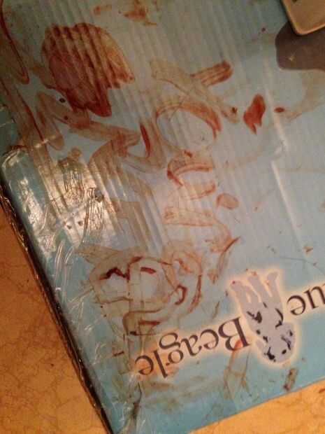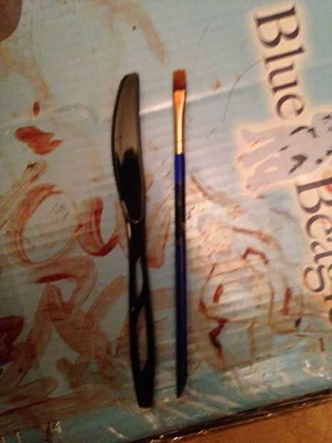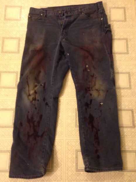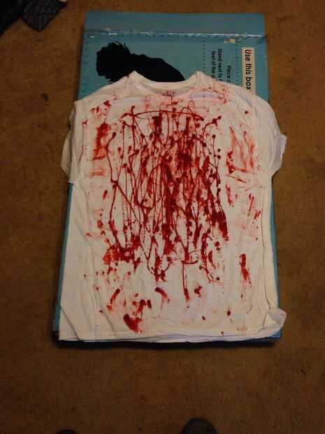 Ahora viene la diversión de hacer la camisa y los pantalones. Usé una simple camisa blanca y un par de viejos trabajo pantalones con agujeros en las patas para esta parte. Comencé por bajar una caja de cartón como mi espacio de trabajo y puso la camisa en él. Entonces empecé a hacer el patrón de salpicaduras por sacudiendo la sangre en él con el cuchillo de plástico y untando con mis dedos. Lo hice el mismo proceso para el pantalón pero también añadido huellas aplicando la sangre directamente a mis manos y colocarlas en las piernas. Entonces deje la sangre secar antes de intentar cualquier pieza.