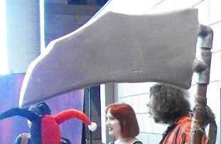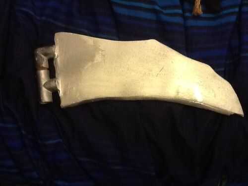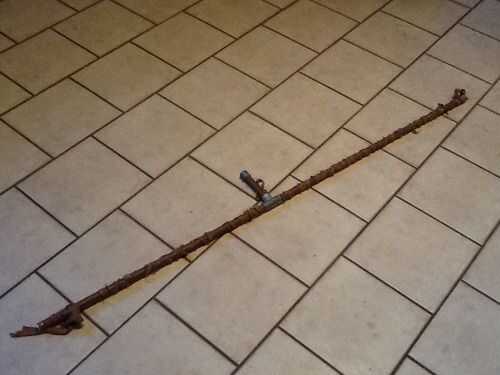 Fijar la hoja al mango poniendo un pedazo de pvc entre un adaptador de pvc T y L curva adaptador de pvc. (foto B) conectar las piezas entre sí, pintura marrón y enrollar algunos largo raggedy cinturones de tela marrón alrededor de él.