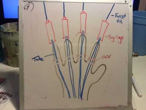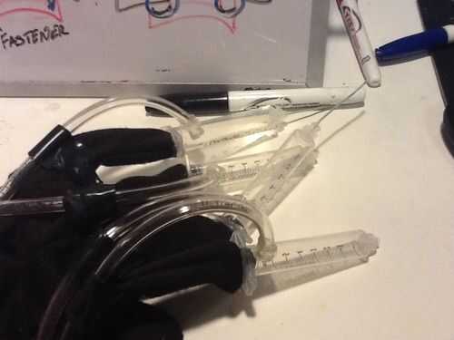 Tomar sus jeringas y utilice la punta de la pistola de pegamento caliente para empujar los agujeros en la parte inferior de cada uno. Coloque el acuario de la tubería dentro del agujero con pegamento caliente. Colóquese el guante de sí mismo y pegar cada jeringa en la punta de su dedo. Usar alguna cinta y fije cada tubo de acuario alrededor de tu dedo. Por último, cortar sus lazos twisty de aproximadamente 3 pulgadas de largo y caliente pegamento en los extremos de las jeringas. (foto G)
