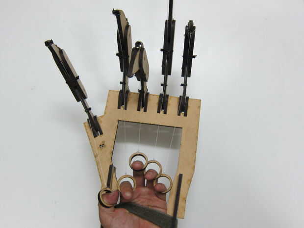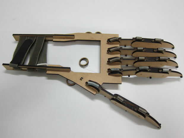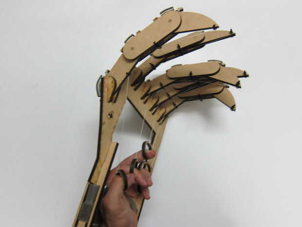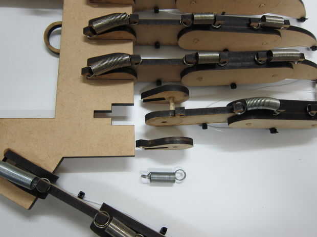 Ted Hung y yo diseño mecánico manos está diseñado por Inkscape y Ai. El concepto básico es tomar el máximo de cortador del laser. El archivo se fije en lo siguiente y no dude en usar y modificarlo. Cortar 6 mm aglomerado por láser de corte, con varilla de 4 mm para conectar cada empalme, cortar el resorte en pedazos y gancho para cada articulación para proporcionar fuerzas para sostener las articulaciones.