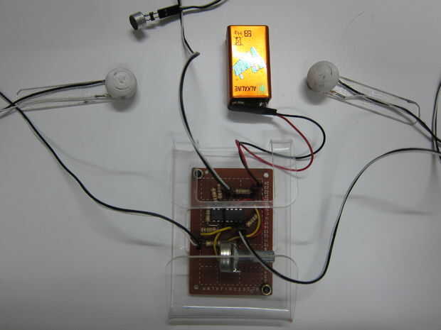 Materiales* Dos tiras de trapo blanco de aproximadamente 12 pulgadas de ancho.* Una bola plástica flexible (aproximadamente del tamaño de un beísbol con pelota blanda).* Unas tiras de hilo o cadena.* Una resistencia de 1K (1.000) Ohm.* Dos LED ' s ro