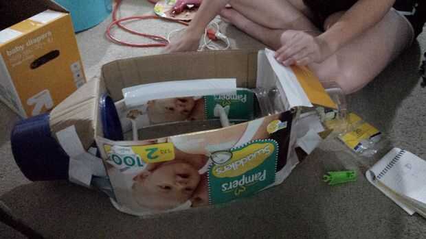 Corte un orificio circular que empareja el cubo para el motor de apoyo en el frente de la caja. Corte un agujero en la parte posterior de la caja para impulsar un bote de basura plástico. Después de empujar el cubo y bote de basura a través de los orificios, use la pistola de pegamento caliente para pegarlas a la cartulina.