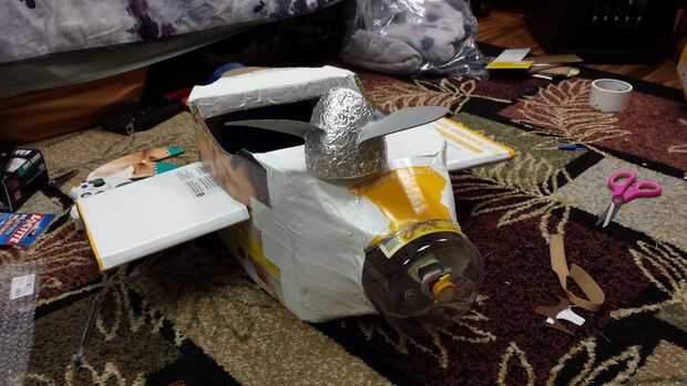 A continuación, levante el ala junto al cuerpo para marcar lo que recortar para poder introducir el extremo del ala. Antes de insertar el ala, corte el lado del fin de insertarse para que pueda ser doblado para arriba y utilizado para apoyar el ala en el interior. Insertar el ala, doble las lengüetas y cinta en el interior del conducto.