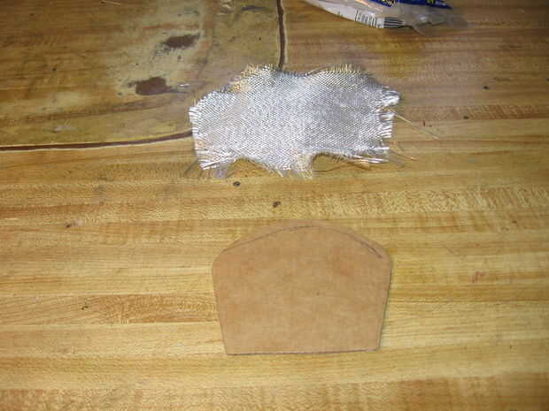 Aquí estoy creando la armadura de Jefe Maestro guantes. Comencé cortando un pedazo de cartón que empareja la forma de la armadura de guante de una imagen que encontré de Jefe Maestro del juego Halo 3. La tela de fibra de vidrio en la cartulina que está por encima de él.
