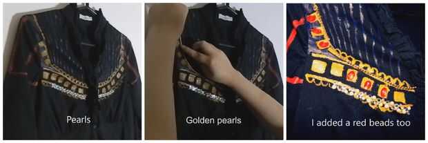 Pinté mi falda negra con pinturas acrílicas y añadí perlas y perlas con pegamento caliente.