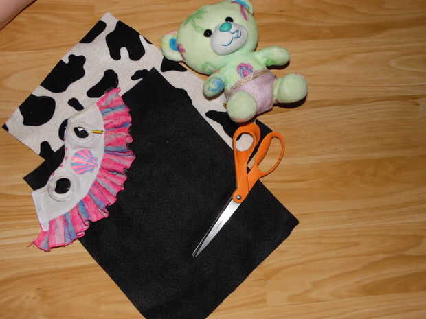 Si salgo todas las cosas es necesario, no tienes que correr, consiguiendo cosas que necesita todo el tiempo. Necesita negro fieltro, vaca manchas sentía {si no lo encuentras, simplemente coser puntos vaca fieltro negro sobre un trozo de fieltro blanco] una pieza de ropa de su animal {usé un vestido} tijeras de costura y por supuesto, el animal por lo que puede probar la ropa a veces, si no estás seguro que estás haciendo lo correcto.