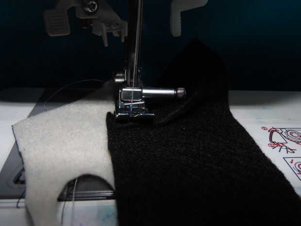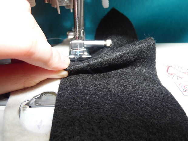 Coser el rectángulo negro en la parte superior como una falda. Doblar y coser. Si es vestido es sobre o de la misma longitud que el mío, empezar a coser la falda un poco al lado de la sisa. Cortar dos rectángulos de fieltro si es vestido es bastante grande.